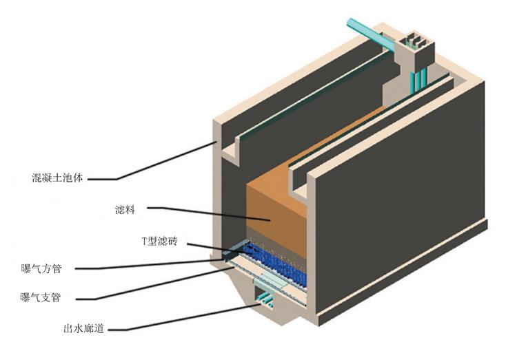 滤池底部设有进水和排泥管,中上部是填料层,厚度一般为2.5~3.5m,为防止滤料流失,滤床上方设置装有滤头的混凝土挡板,滤头可从板面拆下,不用排空滤床,方便维修。挡板上部空间用作反冲洗水的储水区,其高度根据反冲洗水头而定。