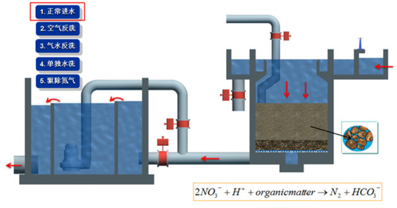 关闭反冲洗水泵和排水阀,让滤料自然沉降(静置 2-3 分钟),恢复至原滤床高度(3-6m),观察滤床表面是否平整。打开滤池上部排气阀,排出滤料间隙中残留的空气,重新开启进水和硝化液回流,滤池恢复正常的过滤和反硝化运行。