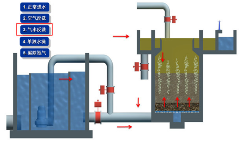 开启反冲洗空气阀,通过底部布气系统向滤料层通入空气,利用空气的搅拌作用,使滤料颗粒相互摩擦、碰撞,松动滤料层,将附着在滤料表面的污泥、老化生物膜初步剥离,此阶段一般持续 3-5 分钟。