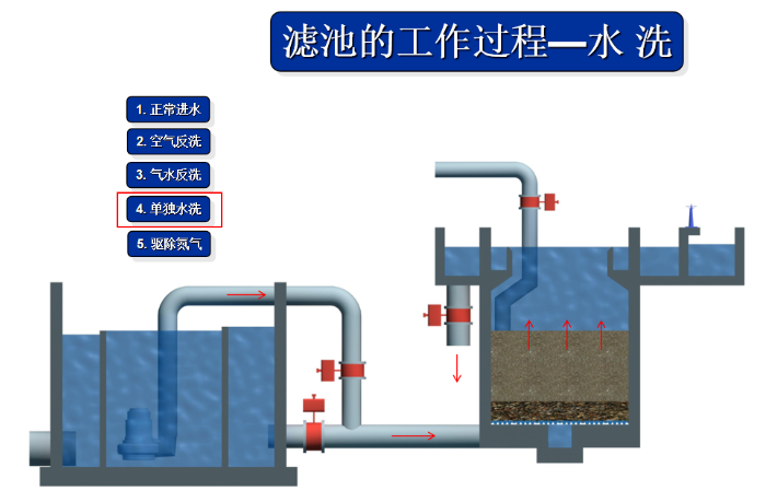 关闭空气阀停止气冲,保持反冲洗水的通入,利用水流的冲刷和携带作用,将滤池内悬浮的污染物通过反冲洗排水阀排出池外,同时使滤料层重新平整,恢复过滤结构,此阶段约 3-5 分钟。