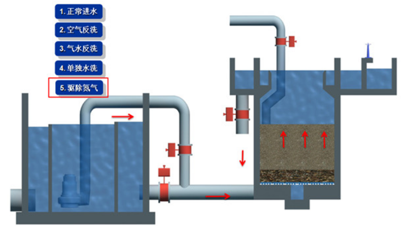 反冲洗准备阶段,停止滤池的进水和硝化液回流,关闭滤池的出水阀,将滤池内的水位调整至合适高度(一般略高于滤料层表面),同时启动反冲洗风机和反冲洗水泵,做好动力准备。