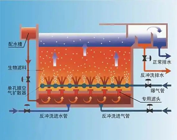 曝气生物滤池通常由粒状的填料床组成,曝气装置安装在填料床承托层或靠近它的地方,流过反应器的污水既可以是上流式也可以是下流式,污水中的底物和充足的氧气使滤料表面附着生物膜。